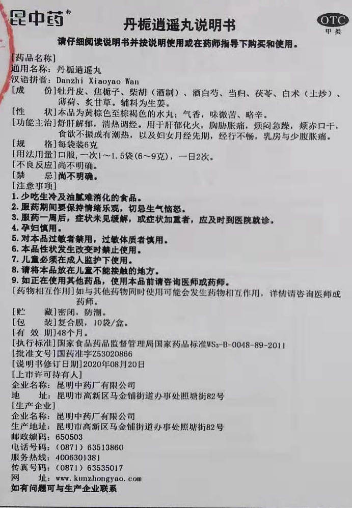 - 商品名称:云昆 丹栀逍遥丸 6克*10袋