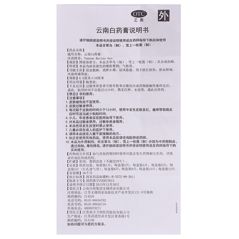 - 生产企业:云南白药集团无锡药业有限公司委托云南白药集团股份有限公司(原:委托江苏南方卫材医药股份有限公司)