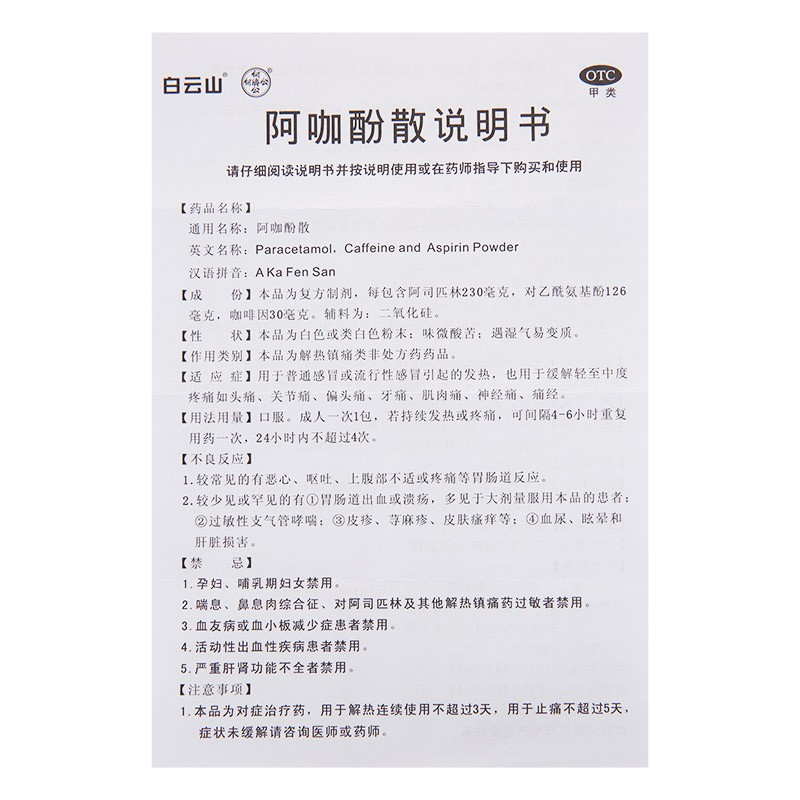 - 商品名称:白云山 阿咖酚散 100袋/盒