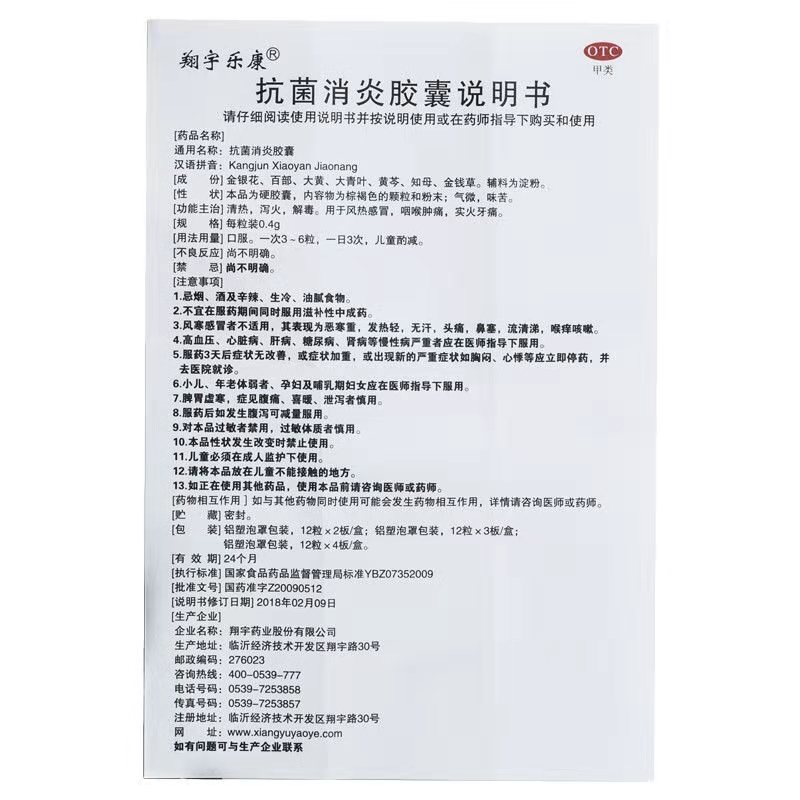 • 商品名称:翔宇乐康 抗菌消炎胶囊 0.4g*12粒*3板/盒