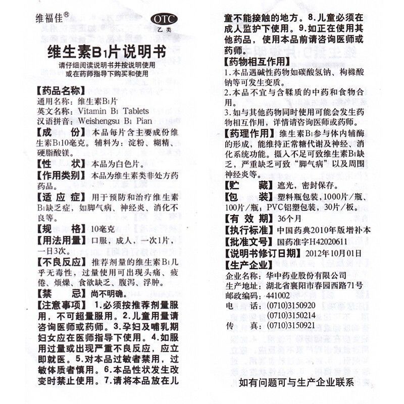 • 商品名称:维福佳 维生素B1片 10mg*100片/瓶
