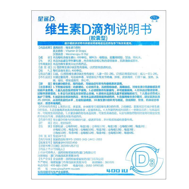 • 商品名称:星鲨D 维生素D滴剂 36粒/盒