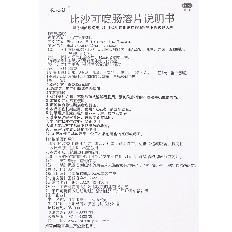• 商品名称:泰必通 比沙可啶肠溶片 5mg*7T