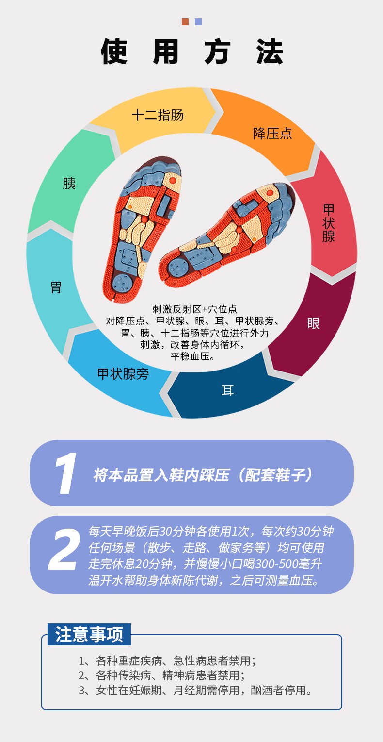- 用法用量:1、依据人体足底尺码大小,选择规格不同的穴位压力刺激板,2、根据自身症状,对应足底穴位的适用范围,选取球状穴位点组成对症的穴位压力刺激板,3、组合后的穴位压力刺激板可单独踩压或置入鞋内踩压,利用人体行走产生的自然压力,刺激足底穴位,4、每天早晚各使用一次,每次30分钟左右,5、产品可用洗衣液、清水正常清洗、冲洗。自然晾干,不可烘烤暴晒