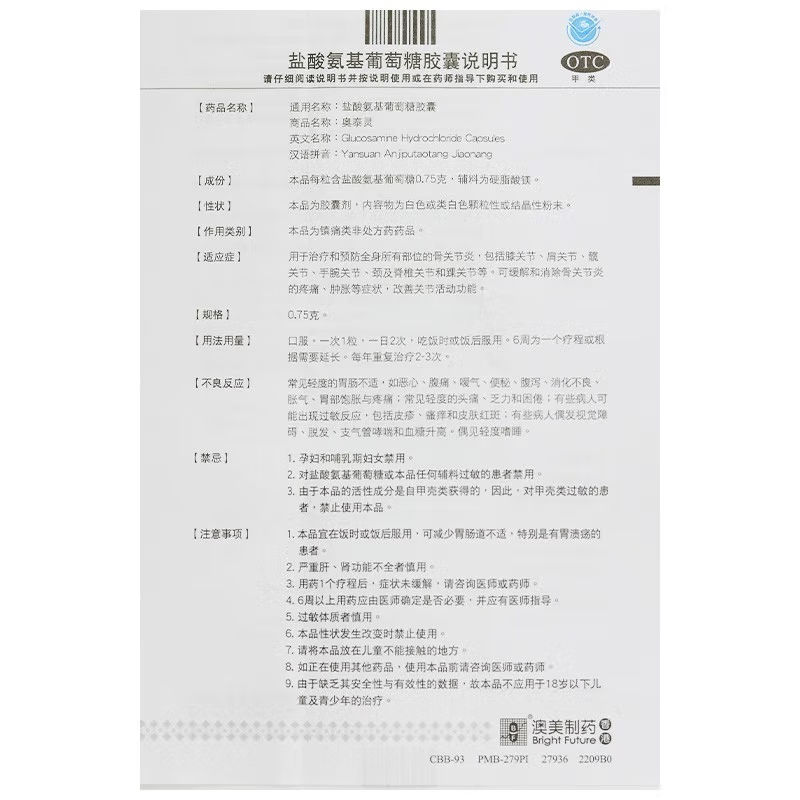 - 商品名称:奥泰灵 盐酸氨基葡萄糖胶囊
