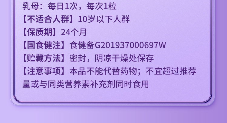 - 用法用量:11-13岁:每日1次,每次1粒;14-17岁:每日1次,每次1粒;成人:每日3次,每次2粒;孕妇乳母:每日1次,每次1粒。饭后温水送服