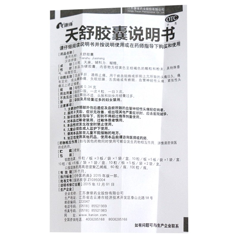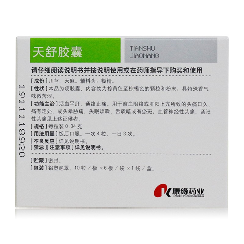 - 商品名称:康缘 天舒胶囊 0.34g*60粒/盒