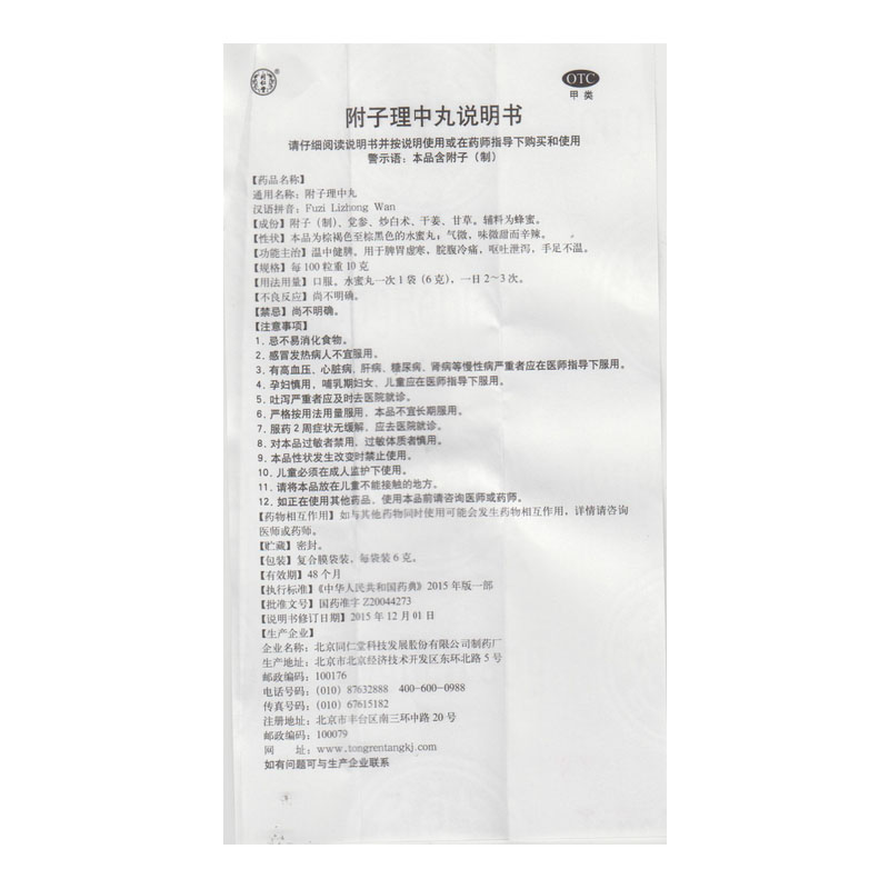 - 商品名称:同仁堂 附子理中丸 6g*10袋/盒