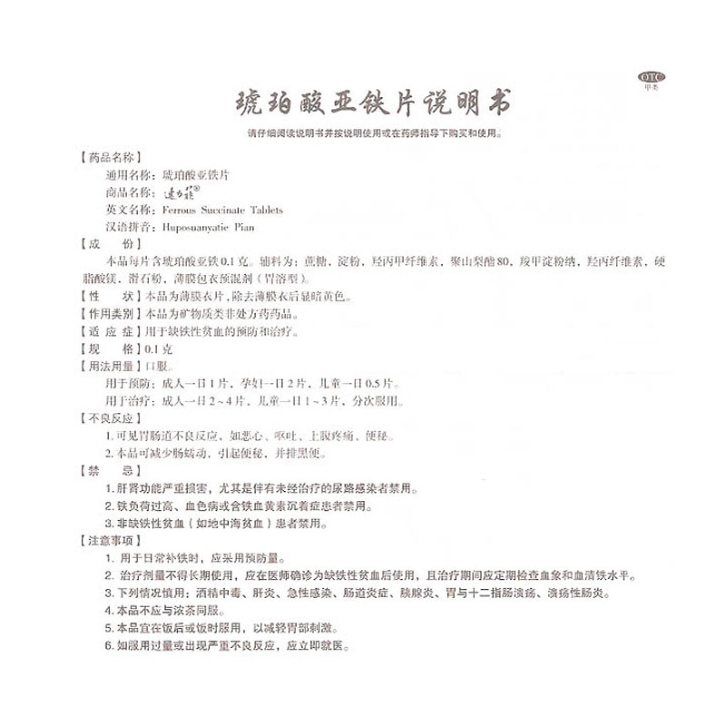 - 适应症/功能主治:用于缺铁性贫血的预防和治疗。