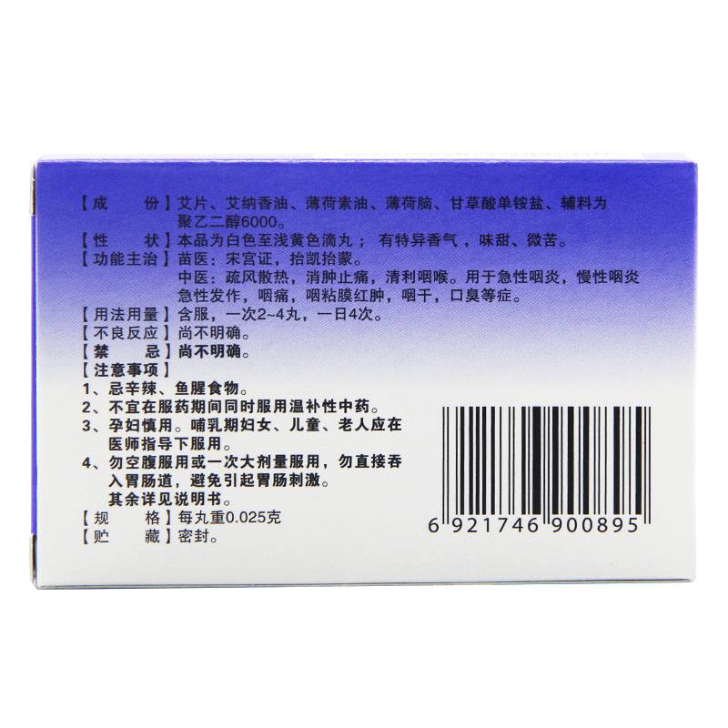 - 适应症/功能主治:疏风散热,消肿止痛,清利咽喉。用于急性咽炎,慢性咽炎急性发作,咽痛,咽粘膜红肿,咽干,口臭等症。