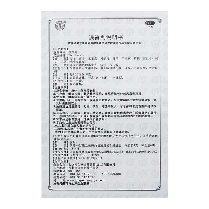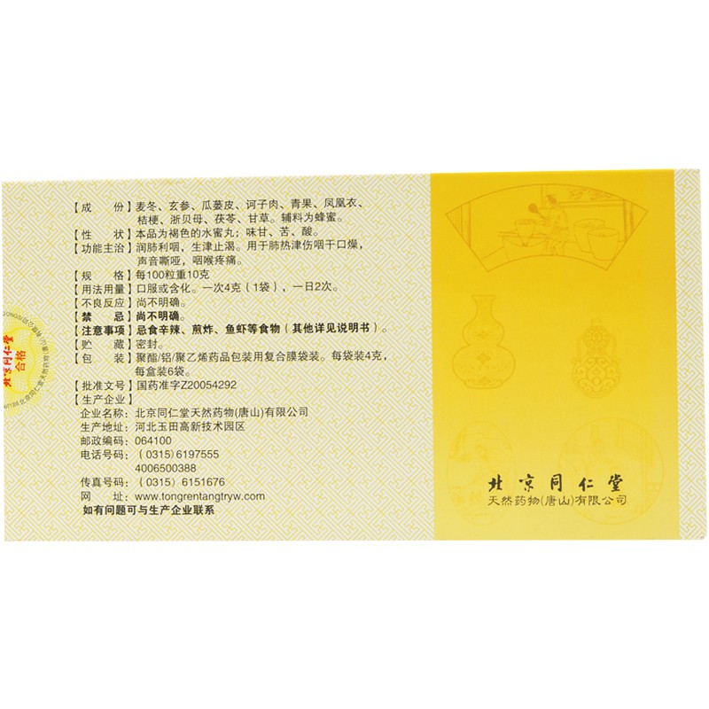 • 商品名称:同仁堂 铁笛丸 4g*6袋/盒