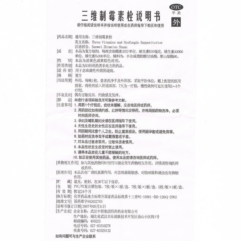 - 适应症/功能主治:主治念珠菌性阴道炎(霉菌性阴道炎)。用于外阴奇痒、灼痛、白带过多、白带稠厚呈豆渣样、阴道充血、外阴炎症、白带霉菌等