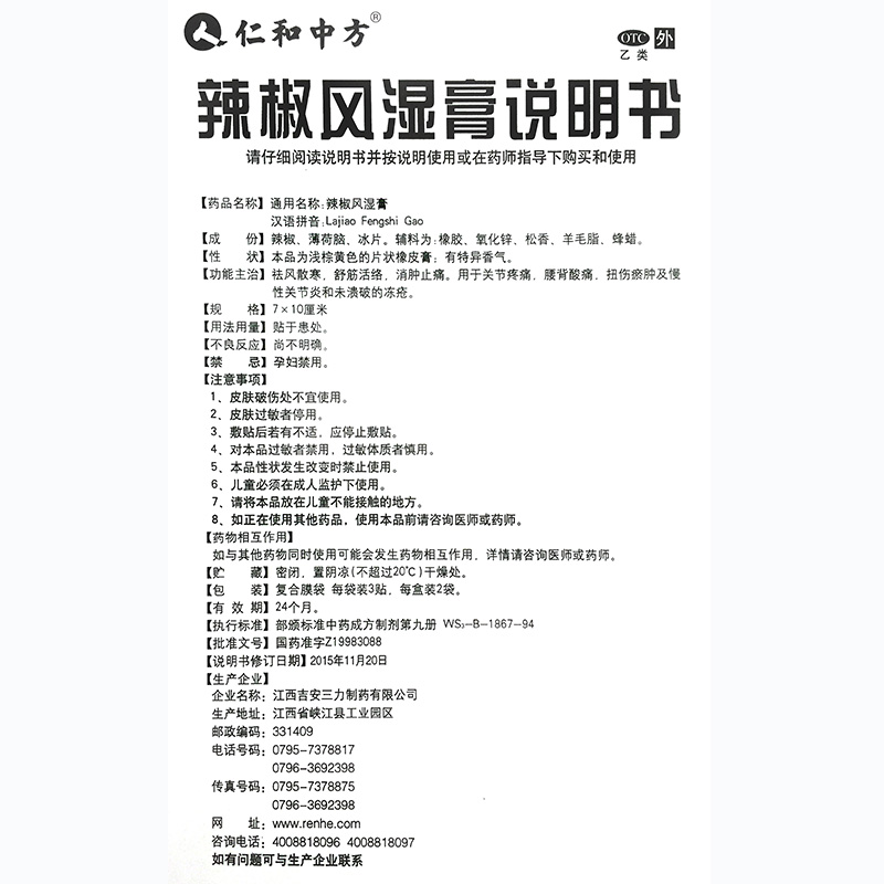- 商品名称:仁和中方 辣椒风湿膏 7*10厘米*3贴*2袋